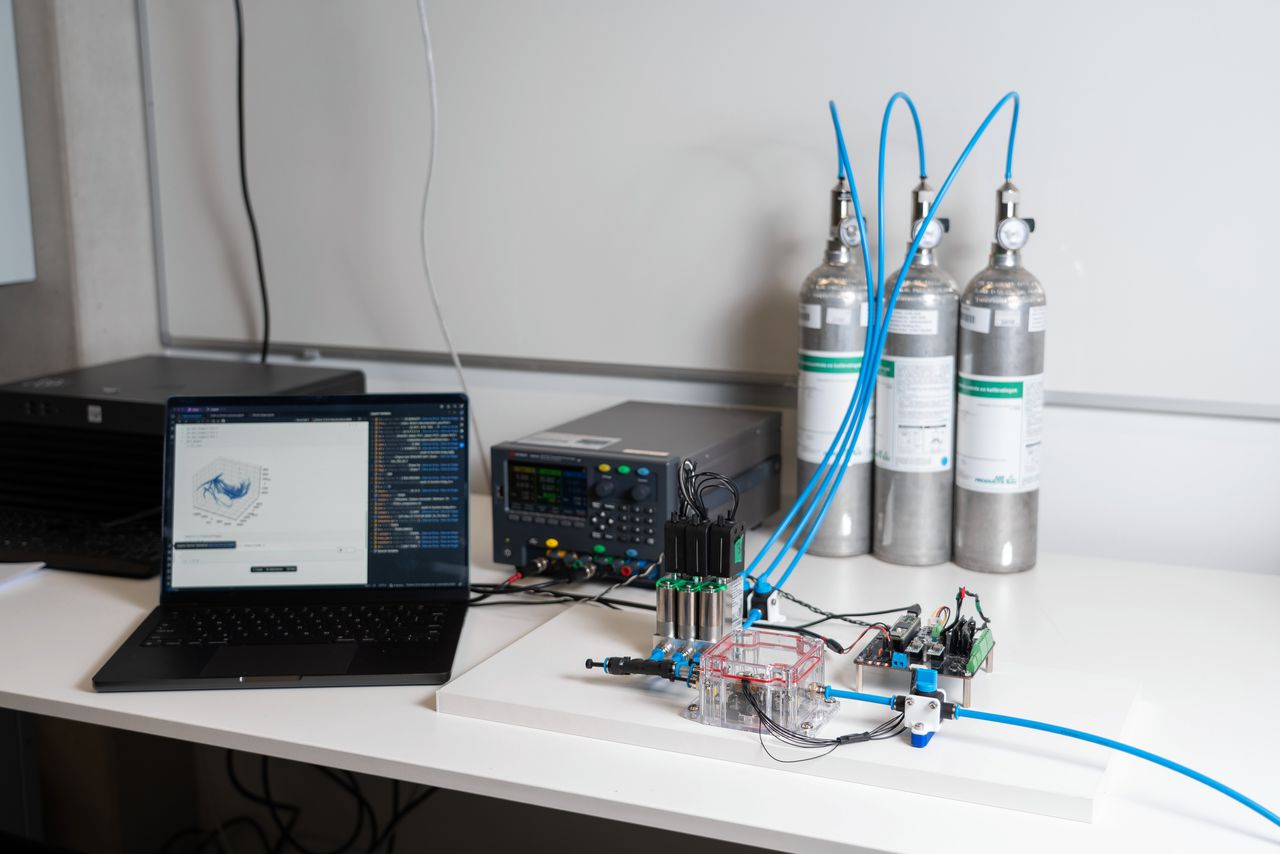 Op een vrijdagnamiddag probeert Ton Juny Pina de ruikende hersenen van een fruitvlieg na te bootsen. Op de tafel voor hem ligt een doorzichtig plastic doosje met daarin een batterij gassensoren die eruitzien als kleine vingerhoedjes. Door het doosje kan de onderzoeker aan de Rijksuniversiteit Groningen verschillende gasmengsels laten stromen, waarop de sensoren dan allemaal reageren. „We hebben zestien sensoren die gevoelig zijn voor verschillende gassen, maar om eerlijk te zijn, zijn zulke sensoren niet heel selectief: ze reageren typisch allemaal wel een beetje op een heel breed palet aan gassen”, zegt Juny Pina.