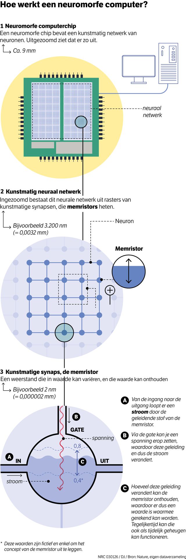 Zo’n neuromorfe chip bestaat uit een raster van horizontale en verticale lijnen, die op de kruispunten verbonden zijn met memristors. Het woord is een combinatie van memory (geheugen) en resistor (elektrische weerstand). Dit is een elektrische weerstand die in waarde kan variëren, en die de waarde ook langere tijd kan onthouden, als een lokaal geheugen. Het geheel kan een matrixvermenigvuldiging razendsnel uitrekenen zonder dat er processoren of transistoren aan te pas komen, en daarmee ook een berekeningsstap in een neuraal netwerk. De Groningse spin-off IMChip werkt aan de ontwikkeling van een neuromorfe computerchip.
