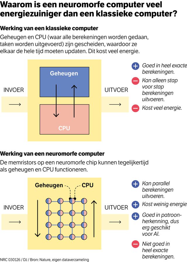 Een van die principes heeft te maken met een fundamenteel verschil tussen hersenen en computerchips, zegt Yoeri van de Burgt, een onderzoeker aan de TU Eindhoven, een van de Nederlandse pioniers in het gebied. „Digitale computers werken volgens het Von Neumann-principe: een berekening doe je in een processor, en dan stuur je de uitkomst naar het geheugen. Voor een volgende berekening haal je weer gegevens uit het geheugen, en zo ben je de hele tijd gegevens heen en weer aan het sluizen.”